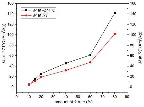 The highest values of magnetization at the temperature of −270 °C and at RT were revealed for the P20-F80 sample: 142 Am2/kg, and 102 Am2/kg, respectively. So, the decrease in the value of M is 71.7% of its initial value. Reducing the amount of ferrite in the composite significantly lowers the magnetization values (Figure 5 and Table 1). In the case of the sample P90-F10, the value of magnetization is very low, but the difference in the value of magnetization (at low temperature −271 °C and at RT) is not as large as in the case of the P20-F80 sample (there is a slow decrease in magnetization). The magnetization values at −270 °C and RT for sample P90-F10 are 5.2 Am2/kg and 4.4 Am2/kg, respectively (which is 84.6% of the initial value).