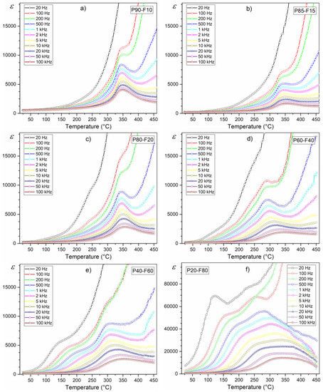 Temperature behavior of dielectric constant of the P-F ceramic composites: P90-F10 (a), P85-F15 (b), P80-F20 (c), P60-F40 (d), P40-F60 (e), and P20-F80 (f).