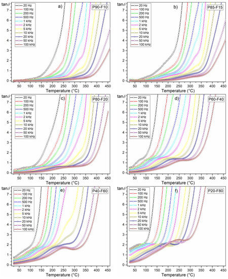 Temperature behavior of dielectric loss of the P-F ceramic composites: P90-F10 (a), P85-F15 (b), P80-F20 (c), P60-F40 (d), P40-F60 (e), and P20-F80 (f).