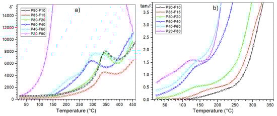 The influence of the magnetic component (ferrite) in the composite is also visible on the tanδ(T) temperature plots of the composite samples, i.e., in the form of an increase in dielectric loss (Figure 7). At room temperature (for 1 kHz) for the P90-F10 composition, the tanδ value is 0.01, while for the P80-F20 composition, it is 0.68. For the compositions with high ferrite content, the dielectric loss in the whole measurement area is significantly high (Table 1, Figure 8b). In the summary graph, ε(T) and tan δ(T) (Figure 8a,b, respectively) for 1 kHz show the effect of the amount of ferrite on the dielectric properties in the ferroelectromagnetic composite samples. Increasing the ferrite in composite samples causes the electric permittivity to decrease, whereas the diffusion phase transition increases. Completely extreme high values of electric permittivity occur for P20-F80 composite sample. Additionally, increasing the ferrite in composite samples causes rapid growth of the dielectric loss, which is a negative phenomenon in terms of application possibilities.