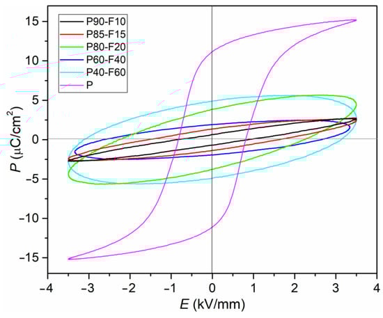 Figure 9 shows electrical hysteresis loops for composite P-F samples, measured at RT and at a frequency of 5 Hz. For comparison, the figure also includes a hysteresis loop for P material that forms the basis ferroelectric component of the composite material. The P–E loop for P material demonstrate good saturation and is characteristic of ferroelectric soft materials, i.e., materials with majoritarian soft dopants. The presented plots of P(E) confirm that the magnetic addition (Ni0.5Zn0.5Fe2O4 ferrite) worsens the ferroelectric properties in the P-F composite. Figure 9 depicts that ferrite contributes to obtaining the shape of the electric hysteresis loop characteristic for linear dielectrics with losses. The loops are rounded and show no saturation for samples with a high ferrite content. With the increase in the ferrite in the composite composition, these effects intensify (and additionally, the leakage current also appears). The consequence of this is that for the P20-F80 sample, it was not possible to obtain a hysteresis loop at RT due to very high charge leakage currents.