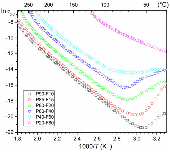 At RT, the P-F composite samples have middle values of ρDC resistivity, i.e., from 9.59 × 106 Ωm (for P90-F10) to 2.23 × 105 Ωm (for P20-F80)—Table 1. The negative effect of the amount of ferrite in the P-F composite is also visible on the temperature lnσDC(1000/T) curves of the composite samples in the form of an increase in electrical conductivity (Figure 10). The lowest DC electrical conductivity are exhibited by samples P90-F10 and P85-F15. As the amount of ferrite in the composite increases, the electrical conductivity definitely increases, and for the composition with the highest amount of ferrite (P20–F80), it is by far the highest over the entire temperature measurement region. Based on the slope of the curves lnσDC(1000/T) and Arrhenius’ Equation (1), the activation energies EAct were calculated (in temperature regions with linear dependencies of the lnσDC(1000/T) plots—Table 1).