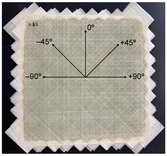 An eight-layer unidirectional tape layup was selected with the following fiber architecture: . The fiber architecture of the unidirectional tapes was intended to increase the amount of ply delamination that occurs under low velocity impact. Delamination in multi-angle composites under low velocity impact loading was found to be more likely to occur at ply interfaces where there was a large mismatch in bending stiffness or fiber angle changes of 90° [33,34,35]. This behavior was confirmed by two studies where different fiber architectures were tested and compared in terms of their energy absorption and ply delamination under low velocity impact loading [36,37]. A photograph illustrating the tape layup on a panel is shown in Figure 1.