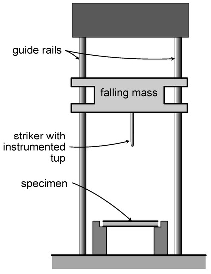 Low-velocity impact testing was performed with a drop-weight testing system (Instron 9350 CEAST (Instron, Norwood, MA, USA)), a simplified schematic of which is shown in Figure 3. As with any dynamic testing, the potential for inertial effects needed to be considered. Different approaches have been used to account for inertial effects during low-velocity impact testing of concrete [42,43]. In certain situations where the mass of the impactor is significantly larger than the mass of the specimen, the inertial effects have typically been neglected [14,44]. For the panels tested here, the mass of the impactor was more than three times larger than the mass of the heaviest specimen; thus, the inertial effects were not included in the low-velocity impact testing analysis.