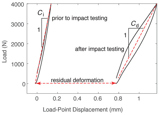 In addition to the data collected by the drop tower instrument, residual deformation and change in compliance were used to evaluate the impact performance of the panels. These parameters, illustrated in Figure 4, were measured by first inserting the panel into the servo-hydraulic load frame described in Section 3.1. The LVDT was zeroed, and a load of 4 kN was applied (2 kN for the panels without composite reinforcement). The initial compliance was taken as the inverse of the slope of the load versus load-point displacement plot. After impact testing, the damaged specimen was put back into the static frame. The initial LVDT reading was taken as the residual deformation. The specimen was then loaded to 4 kN and unloaded. Due to significant hysteresis in the damaged specimen, damaged compliance was measured using the two points: initial (residual) deformation (at zero load) and the deformation at 4 kN, as illustrated in Figure 4. Change in compliance was simply calculated as .