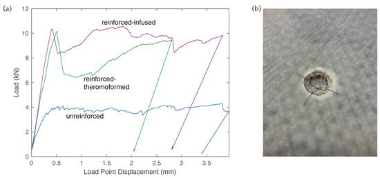 Example results: (a) quasi-static load-deformation plots for three different specimen types, and (b) example CFRTP load point damage (b).