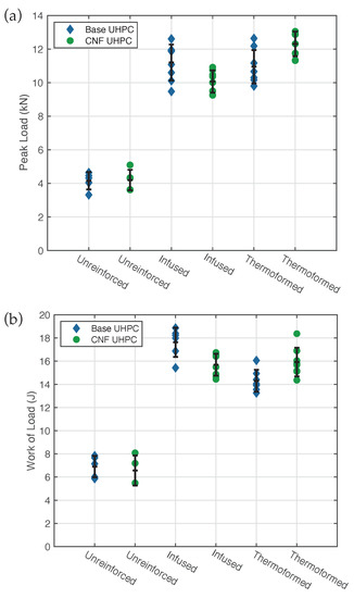 Each load-deformation plot was evaluated by determining the peak load and by calculating the work of the load up to a 2 mm load-point displacement. Peak loads for all specimens are shown in Figure 6a. The error bars represent one standard deviation above and below the mean value for peak load. Minimal variation between UHPC panels with and without CNF was observed, suggesting that the CNF provided little to no additional strength. As expected, the addition of CFRTP reinforcements to the UHPC significantly increased the load carrying capacity. The infused specimens showed a 155% increase over the unreinforced specimens, whereas thermoformed specimens showed a slightly larger 178% increase in mean peak load. Similar improvements were seen with the net work of load up to a deflection of 2 mm, as shown in Figure 6b.