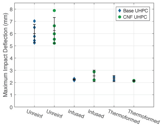 Figure 7 shows the maximum tup/panel deflection during a 16 J impact for all specimen types. As expected, the unreinforced UHPC panels had a significantly greater deflection during impact than the CFRTP-reinforced panels. Upon post-impact examination, the unreinforced UHPC panels had significant radial cracking on the rear face of the panels. The unreinforced specimens had a broad distribution of results, likely due to the random orientation of the steel fibers [8,45,46]. The plot shows the significant reduction in the maximum deflection when the CFRTP is added. The infused reinforcement reduced the mean maximum impact displacement by 61%, while the thermoformed reinforcement was slightly more effective, reducing the mean maximum impact displacement by 64%. In all cases, the CNF addition to the UHPC mix had little to no effect, and the difference between the results of the two CFRTP reinforcements was minimal.