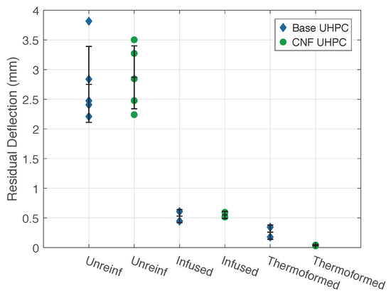 Residual deflection was used in this study as one measure of impact damage, illustrated in Figure 4. Figure 8 demonstrates the residual deflection of all specimen types at an impact energy of 16 J. The figure shows that specimens with CFRTP reinforcement had significantly lower residual deflections than the unreinforced UHPC panels. This was due to the brittle punching shear failure of the UHPC. The thermoplastic composite reinforcement on the rear face of the panel was effective at catching the displaced concrete, resulting in lower residual deflections. There was no significant difference between the performance of base UHPC and CNF-modified UHPC. The panels reinforced with infused CFRTP averaged an 81% reduction in residual deflection, whereas the panels with thermoformed CFRTP showed a reduction of over 95%.