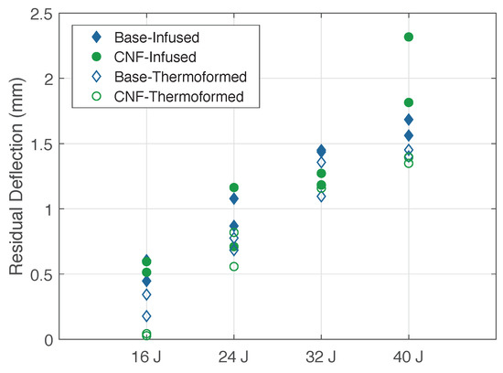 Figure 9 shows the residual deflection results of the CFRTP-reinforced panels at the different impact energies. As expected, residual deflection increased with impact energy. The degree of scatter tended to be dependent on degree of delamination induced by the impact load, with higher degrees of delamination leading to higher residual deflection.
