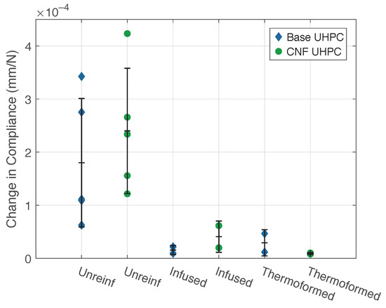 In Figure 10, the change in each specimen’s compliance for a 16 J impact is shown for the different panels types. The change in compliance of the unreinforced specimens showed significant scatter for both the control and CNF-modified UHPC, indicating a wide range in the degree of damage to each specimen. Nevertheless, using mean change in compliance for the unreinforced panels, one can observe a reduction of 87% for the infused CFRTP-reinforced panels and 91% for the thermoformed CFRTP-reinforced panels. The infused panels had a mean change in compliance of mm/N, while the pressed thermoplastic CFRTP-reinforced panels had a slightly lower change at mm/N.