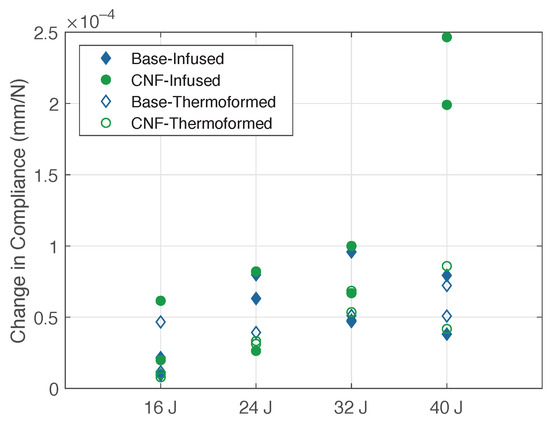 Figure 11 shows the change in compliance for the CFRTP-reinforced UHPC panels at different impact energies. The base UHPC panels suffered the most damage at 24 and 32 J, whereas the CNF-modified panels showed a change in compliance proportional to the impact energy. It should be noted that the large changes in compliance at 40 J for the infused CFRTP CNF-modified UHPC panels were due to delamination of the rear face thermoplastic. The thermoformed reinforced control UHPC panels had consistent values at 24, 32, and 40 J.