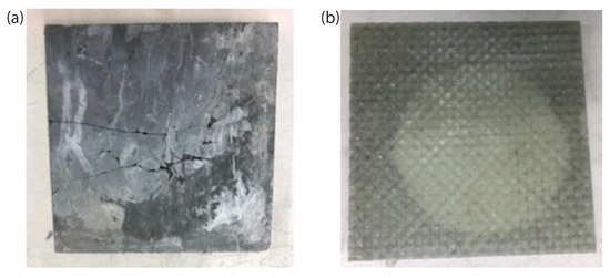 As previously stated, the CNF-modified UHPC panels reinforced with infused CFRTP delaminated when they were impacted at 40 J. Figure 13a shows the reinfused section on the rear face of one of these panels. The dry spot from the initial infusion followed by the reinfusion of the panel was suspected to be the reason for the complete delamination. Typically, the reinforced specimens only suffered radial delamination, but in the case of two specimens, a complete delamination occurred where the infused CFRTP separated from the UHPC. The separation of the infused thermoplastic composite is shown in Figure 13b. No thermoformed specimens suffered complete delamination.