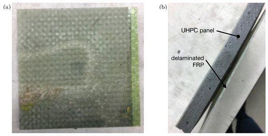 Photos illustrating (a) delamination of infused specimen containing “dry spot” during fabrication, and (b) residual deformation and separation of CFRTP from UHPC after delamination.