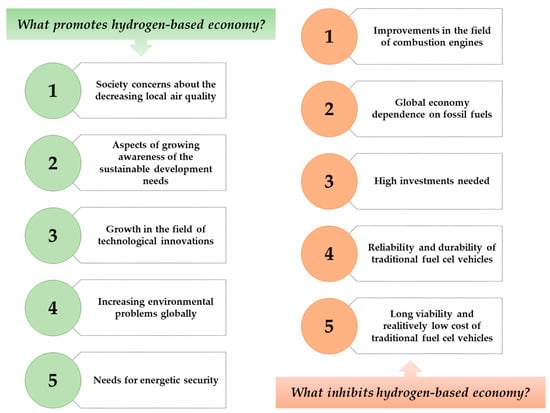 Hence, by observing the trends in the growing needs of the energy industry, scientists are looking for alternatives to traditional energy sources with the benefit of sustainable methods as an alternative fuel source. On this basis, several years ago, work began to intensify on the use of hydrogen as a sustainable energy source [5,6,7]. On Figure 1, there are presented factors that might promote or inhibit the use of hydrogen as an energy source in not too distant future.