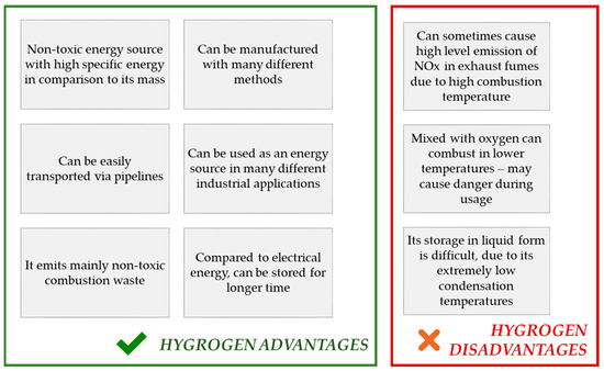 Hydrogen is an element of a great importance. As it is the simplest, the lightest, and the most abundant particle on earth, its accessibility makes it a perfect possible solution in terms of many industrial applications, including its use in energy industries. The use of this element has many advantages with very low number of disadvantages, and all these are mentioned in Figure 2.