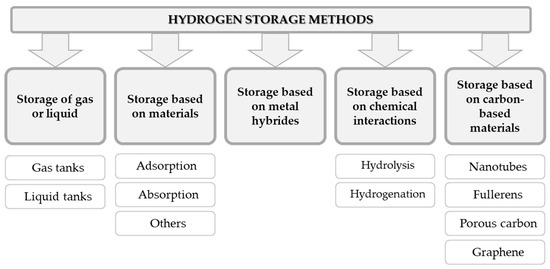 The scheme in Figure 5 presents the most popular methods for hydrogen storage and the mechanisms behind it.