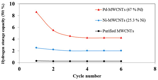 On the other hand, decorating MWCNTs with palladium in the amount of 67 wt.% allowed to obtain even 8.6 wt.% of hydrogen at a pressure of 1.5 bar [51]. However, when the hydrogen uptake and release was repeated six times, this value dropped by 54% (see Figure 6). Earlier publications related to the decoration of nanotubes with this metal showed a hydrogen absorption of less than 0.2 wt.% and this is when using higher pressures [54,55].