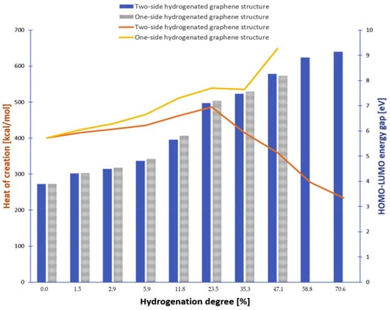 Change in the highest occupied molecular orbital and the lowest unoccupied molecular orbital (HOMO-LUMO) energy gap and the heat of one- or double-sided hydrogenated graphene formation and their hydrogenation degree. Reproduced with permission from Kaczmarek et al., International Journal of Hydrogen Energy; published by Elsevier 2019.