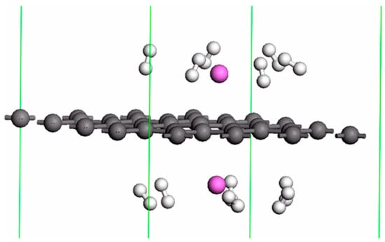 The main assumption behind the use of transition metal decorators deposited on graphene structures is related to the so-called “spill-over effect.” This process involves the initial dissociation of hydrogen in molecular form due to the presence of a catalyst dispersed on the surface. Then, migration of hydrogen to adjacent fragments of carbon material is possible, terminated by the diffusion of atomic hydrogen on the carbon support [82,83]. These processes are particularly important in the case of research into materials for storing hydrogen directly at, or very close to, the room temperature. In this way, it is possible to use both physisorption and chemisorption processes to increase the total value of the sorption capacity. Of course, the obtained results will be undeniably influenced by both the fragmentation and uniformity of the catalyst dispersion, as evidenced by numerous publications conducted on various carbon materials, both nanotubes [84] and activated carbon [85].