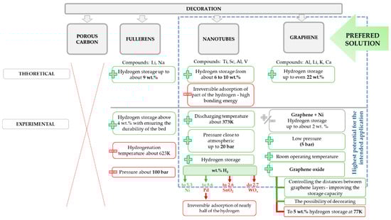 Summary of solutions for carbon-based materials decoration to upgrade their performance for the purpose of hydrogen storage.