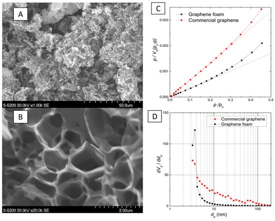 On the left-graphene foam, images obtained via SEM (A,B). On the right-comparison of commercial graphene and a graphene foam in terms of (C) BET surface area; (D) pore size distribution. Reproduced with permission from Lyth et al., International Journal of Hydrogen Energy; published by Elsevier, 2014.