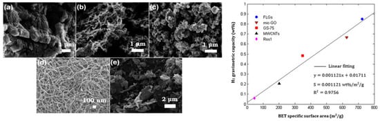 Structures known as graphene sponges are obtained, for example, using the technology of freeze drying [66] and a GO suspension treated with hydroiodic acid. As a result of the adopted production method, spatial graphene was obtained with a specific surface area of approximately 350 m2/g, which at a temperature of 77 K and a pressure of 1 bar obtained a sorption capacity of 0.85 wt.%. That material was compared with other microwave-exfoliated GOs as depicted in Figure 11.