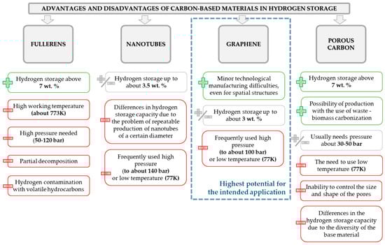 The main contraindication to using hydrogen as an energy source in mobile applications is still the low gravimetric density achieved by the available systems (according to the recommendations of the US Department of Energy, it should be 6 wt.% [19]). Carbon in its various forms (e.g., nanotubes, fullerenes, graphene) create a family of substances that enable the storage of large amounts of hydrogen in a reversible manner, which is confirmed by both computer simulations and experimental results.