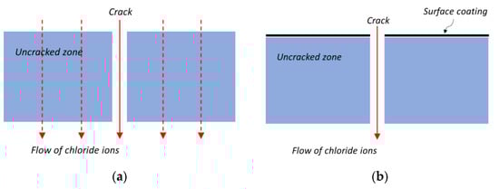 In several previous studies [,,], the penetration paths of chloride ions were divided into crack and uncracked zone as shown in Figure 2a. Under the formulation using a parallel model, the total amount of chloride ion penetrations becomes the sum of the penetrations through the crack and uncracked zone:
