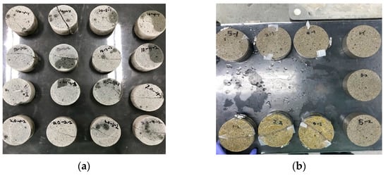 After mixing the materials according to the mixture proportions listed in Table 1, the mixtures were poured into cylindrical molds with a diameter of 100 mm and a height of 200 mm and compacted using a vibrator to prepare specimens. Following air curing for 24 h, the specimens were removed from the mold and subjected to water curing for 28 days.