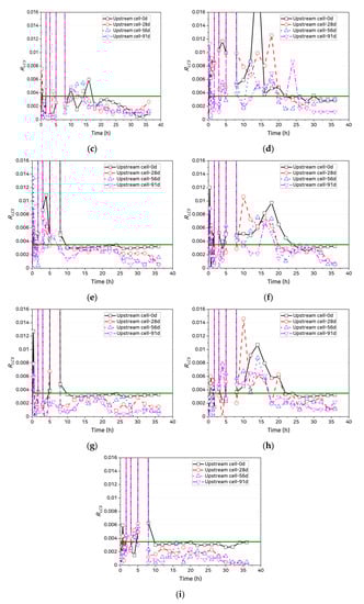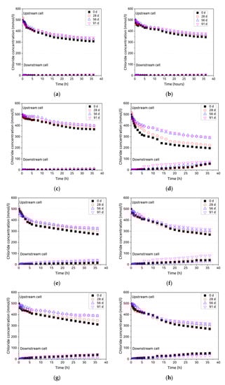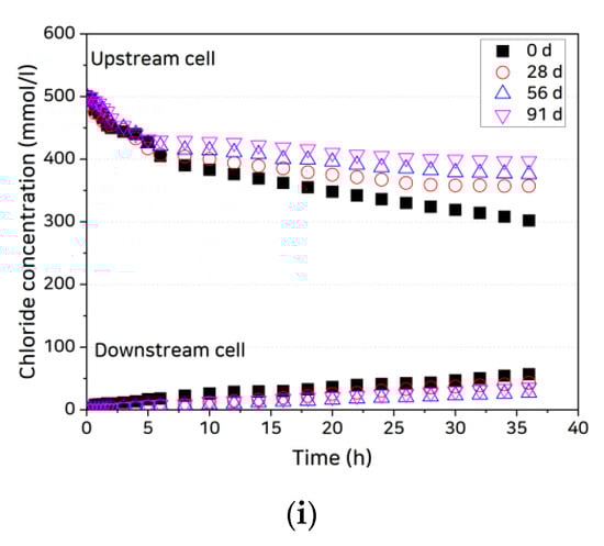 Variation in chloride concentrations in upstream and downstream cells: (a) OPC, uncracked; (b) SHC15, uncracked; (c) SHC30, uncracked; (d) OPC, crack width 0.3 mm, uncoated; (e) OPC, crack width 0.3 mm, coated; (f) SHC15, crack width 0.3 mm, uncoated; (g) SHC15, crack width 0.3 mm, coated; (h) SHC30, crack width 0.3 mm, uncoated; and (i) SHC30, crack width 0.3 mm, coated.