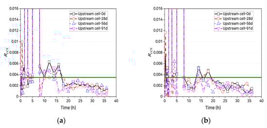 Abro et al. [] reported that, after reaching the quasi-steady state, the magnitude of the standard deviation of becomes less than 1%. However, determining this is cumbersome because the quantitative criterion for the allowable magnitude of the standard deviation is ambiguous, and the deviation must be examined as the size of the measurement section continuously varies. Accordingly, in this study, the rate of change of the log concentration gradient in the upstream cell was measured to better identify the time needed to reach the quasi-steady state. It was assumed that the quasi-steady state was reached when the rate of change of at each time step became lower than the allowable error, that is: