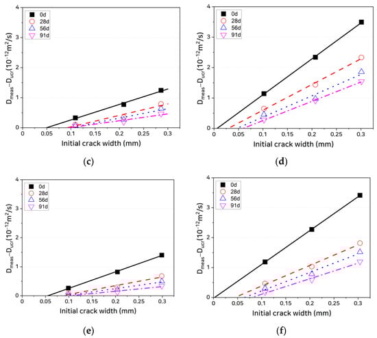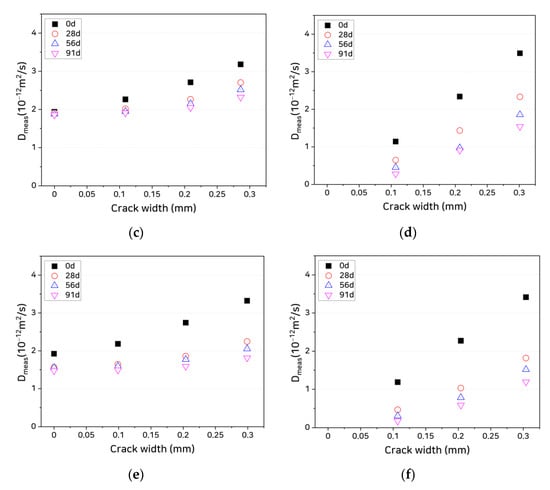 Diffusion coefficient through cracks as a function of crack width: (a) OPC, uncoated; (b) OPC, coated; (c) SHC15, uncoated; (d) SHC15, coated; (e) SHC30, uncoated; and (f) SHC30, coated.