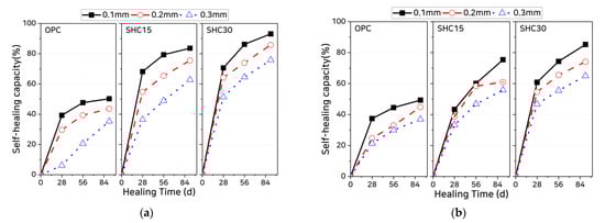 It is seen from Figure 8 that the reductions in diffusion coefficient are much larger in the mixtures containing self-healing materials (SHC15 and SHC30) than in the OPC and that the reduction in diffusion coefficient increases as the self-healing material content increases. The largest reductions in diffusion coefficient are observed at a healing age of 28 days, after which the rate of reduction slowly decreases. To quantitatively evaluate the chloride penetration resistance arising from self-healing, the self-healing capacity can be calculated, following the method proposed by Abro et al. [], as a function of the diffusion of chloride ions through the crack: