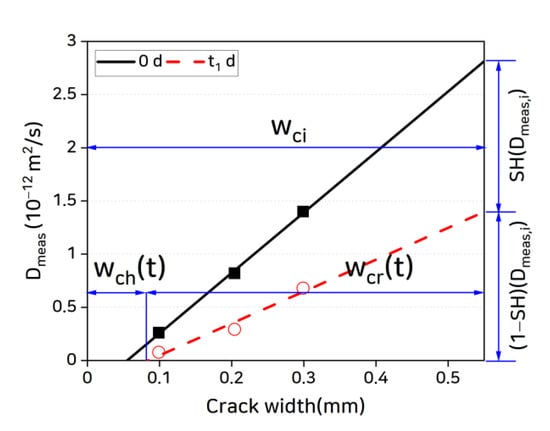 where is the measured chloride ion diffusion coefficient of the specimen, is the chloride ion diffusion coefficient in the uncracked zone, and is the diffusion coefficient in the crack. Assuming , the chloride ion diffusion coefficient in the crack is given as: