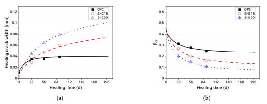 Growth of healed crack width and decrease in with increasing healing age: (a) healed crack widths and (b)