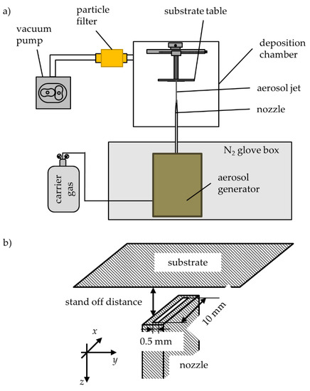 (a) Schematic drawing of an aerosol deposition device including deposition chamber, vacuum pump, and aerosol generating unit; (b) sketch of the nozzle-substrate-positioning.