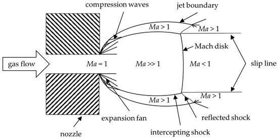 First finite element [15] and molecular dynamic simulations [8,16] that investigate the particle fracture behavior, provide hints on the powder pre-treatment and the particle velocities to be applied for successful PAD coatings. This indicates that a detailed knowledge on the influence of gas dynamics on spray coating processes can be beneficial. It has been investigated in several studies [17,18]. Katanoda et al. and Zabihi Yeganeh et al. presented interesting simulation-based work for PAD [19,20,21]. In the field of cold spraying, which is related to PAD, gas dynamic effects have been discussed by Pattison et al., Samareh et al., and Buhl et al. [13,14,22]. Moreover, Viscusi et al. reported on interesting results on the long-term stability of cold spray depositions based on numerical modeling of the gas flow regime and experiments [23]. According to [20], a basic description of the gas flow expanding into the vacuum can be described as in Crist et al. [24]. Such an expansion is schematically depicted in Figure 2.