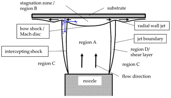 Different from Figure 2, where a free expanding flow is considered, Figure 3 depicts the gas flow between the nozzle and a substrate. The gas flow leaving the nozzle is supersonic in region A. Gas molecules of the jet, interacting with the substrate, change their energy and momentum. Infinitesimal pressure waves transfer these changes to outer regions of the flow. Since pressure waves can neither move up nor downstream, a shock wave forms. This shockwave is called bow shock. The flow downstream of the bow shock is subsonic (region B), and the flow transforms to an outward radial deflection. If the thickness of the bow shock is in the order of the mean free path of the gas molecules, the bow shock does not affect the particles. Between the bow shock and the substrate, a stagnation zone forms where the gas flow has a lower velocity and a higher density. There, the gas flow can even be recirculating [13]. The shear layer (region D) forms between the outermost jet boundary and the intercepting shock. In the boundary layer, expansion waves directed outwards (see expansion fan in Figure 2) are reflected as compression waves (marked in Figure 2) by the ambient pressure [13,25].