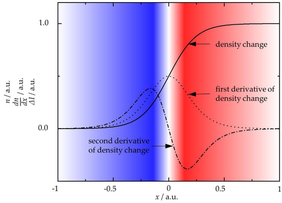 Example of the distribution of refractive index, n (density change), its first derivative, dn/dx, and the intensity change, ΔI, over x; the white-red-blue-transition highlights the ΔI(x).