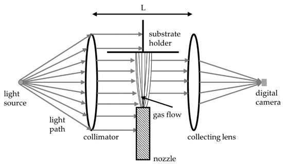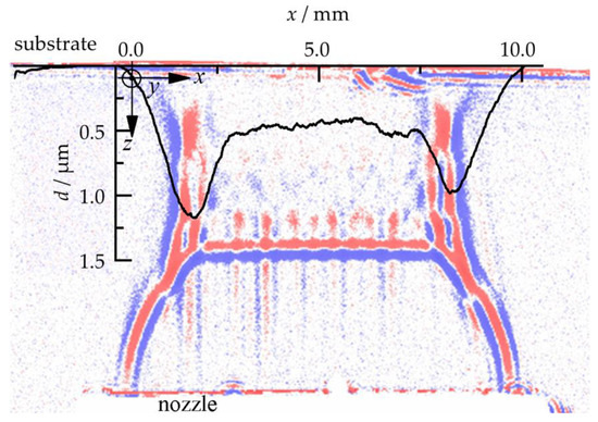 In the following, the gas flow without particles is explained using the gas density distribution, as visualized by a shadowgraph method like in [13,14]. The flow images are correlated with thickness profiles of the as-deposited films. In this work, the coating film quality is assessed by the thickness profile in the x-direction of the slit nozzle.