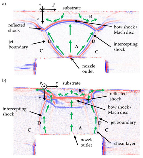 Based on the mentioned simulations from references [20,21], gas streamlines are expected, as indicated in the shadow images by green arrows. The streamlines change their direction as they approach the substrate. In region B, a flow direction reversal towards the nozzle may occur. The shadow images do agree qualitatively with the simulations of [20,21].