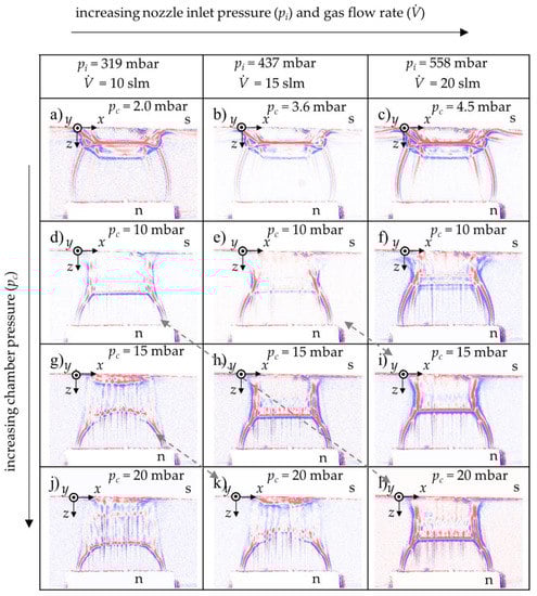 In Figure 7, the flow shape of the gas expansion in the x-z-plane is shown for all chamber pressures and carrier gas flow rates. A bow shock can be observed in all images. It is well visible that higher chamber pressures push the bow shock upstream, towards the nozzle exit. An increase in gas flow rate counteracts this, as explained below. The bow shock is formed with curved shape at lower flow rates and higher chamber pressures (cf. Figure 7g,j,k). Given the curved red-blue transition region upstream of the substrate and the high chamber pressure, the gas density upstream of the substrate should be higher than in the other shadow images.