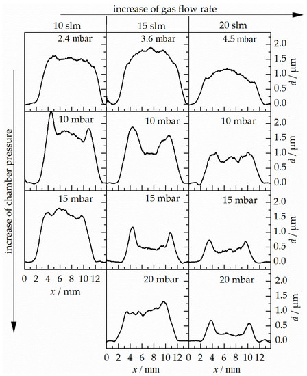 Film thickness profiles (film thickness (d) over film width (x)) of the as-deposited films prepared at different PAD parameter sets (variation of chamber pressure (pc) and gas flow rate ()