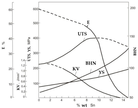 The influence of tin on chosen mechanical properties, the tin bronze hardness change dependent on tin concentration. (E—elongation, UTS—ultimate tensile strength, BHN—Brinell hardness number, KV—impact strength, YS—yield strength) [7].
