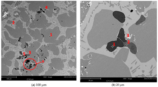 Location of the measurement points for scanning microscope examination with visible impurities and inclusions. (a) 1–6 measurement points for magnification 530×, (b) 1–3 measurement points for magnification 800×.