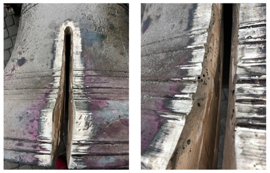 After crack range determination, mechanical treatment of the damaged place was conducted to remove the external oxidized surface (Figure 5). This phase was performed in such way to obtain the best access to whole crack by the welder during the welding process (Figure 6). It was found during mechanical treatment that the bell’s structure is very porous, especially the external surface. This worsened the welding process. The welding process was conducted with the use of an oxyacetylene torch. During this process the bell edges were melted with the welding rods made earlier. Welding was conducted with the use of the “up method”. Better efficiency of welding and very good penetration of the whole thickness of the connected parts were obtained thanks to this method. It was possible to perform the weld with a single torch cut due to this method.
