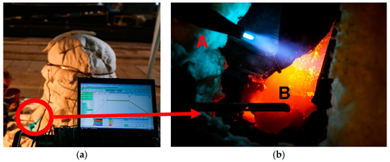 Welding process (a) the bell protected by fibro isolation; red circle–the place of welding (b) close–up of the place of welding. A—acetylene torch, B—bronze rod.