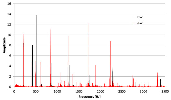 The spectrum of the St. Maryan bell’s sound, before (BW) and after (AW) welding.