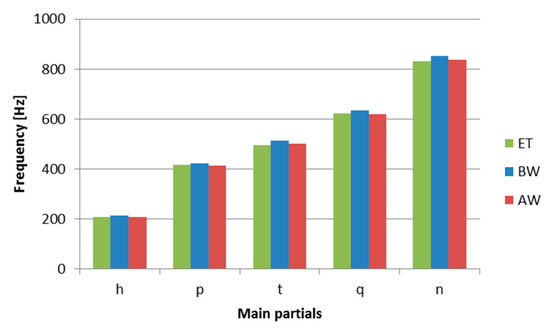 The main partials of the St. Maryan bell’s sound frequencies, before (BW), after (AW) welding and for musical note G#4 according to the equal temperament scale (ET).